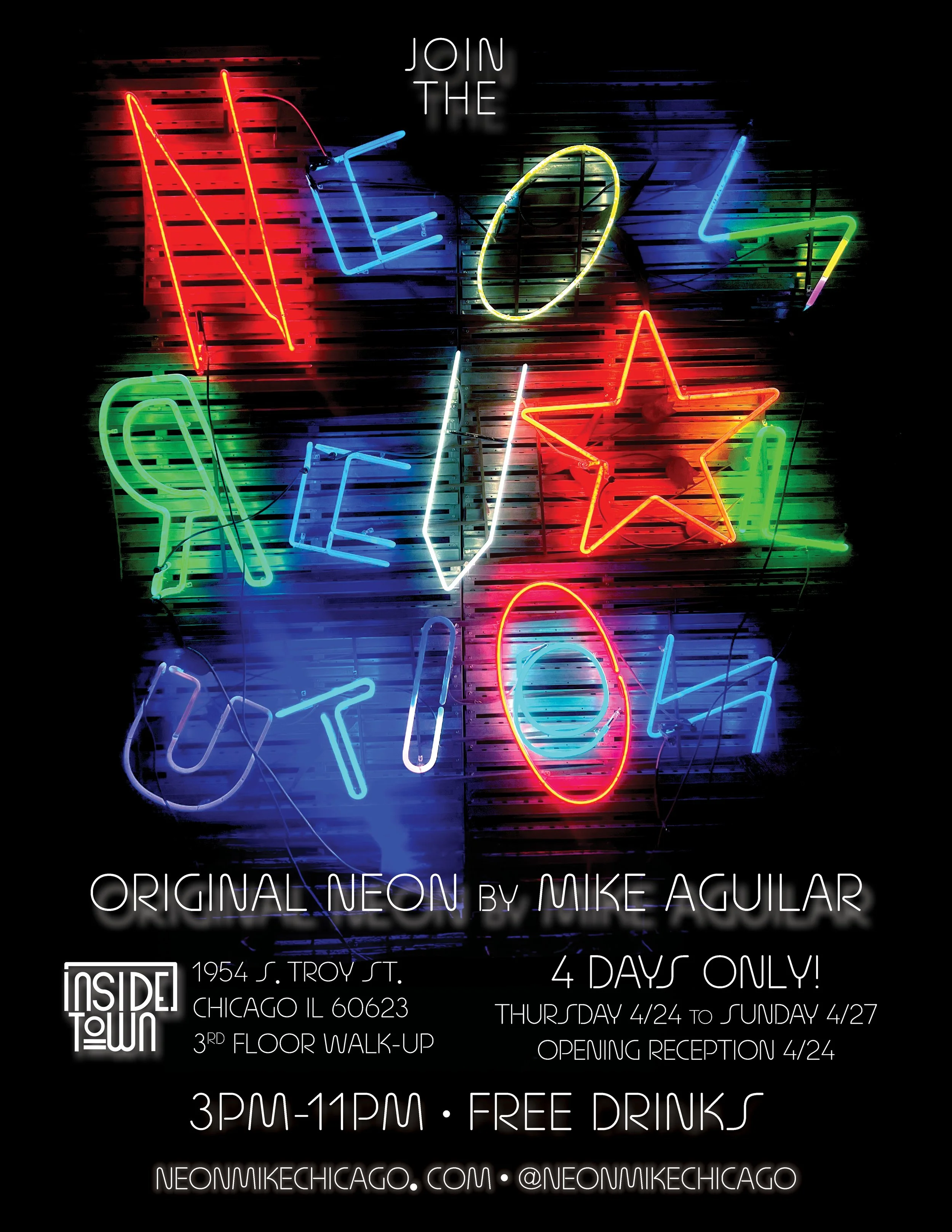 NEON REVOLUTION ignites on Thursday April 24, on display through Sunday, April 27, and open from 3:00 p.m. to 11 p.m., all weekend! An opening reception honoring Aguilar starts at 3:00 p.m. on Thursday, April 27.